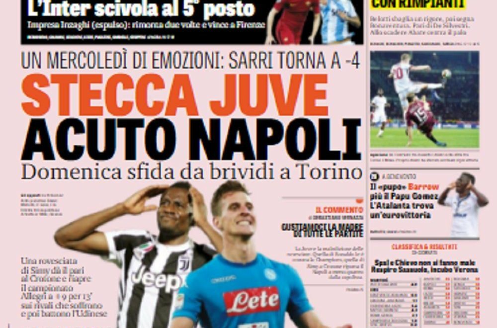 La Gazzetta dello Sport mette in primo piano la corsa scudetto. Il Napoli, nel turno infrasettimanale, ha approfittato del passo falso della Juventus a Crotone per riaprire i giochi. E domenica il big match tra la banda di Allegri e quella di Sarri sarà decisivo per il tricolore. Spazio anche per la corsa Champions con Roma e Lazio che non steccano e rimettono la freccia sull’Inter che riscivola al quinto posto. Torino e Milan non si fanno male, ma ora i rossoneri devono vedersela con l’Atalanta, ieri vittoriosa per 3 reti a zero sul Benevento. Per la lotta salvezza pari tra Chievo e Spal, mentre il Sassuolo trova tre punti d’oro che danno respiro contro un Hellas alla deriva.