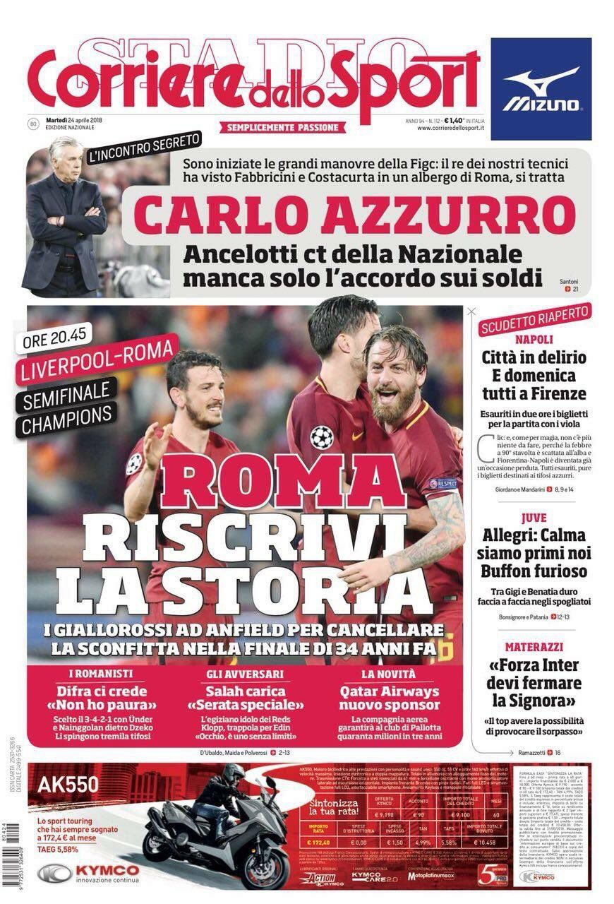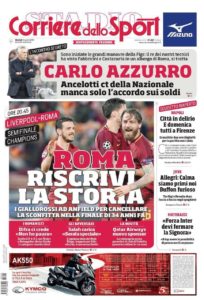 “Roma riscrivi la storia”. Così apre il Corriere dello Sport odierno, mettendo tutti gli occhi sulla semifinale Champions di stasera che vede impegnata la Roma a Liverpool. Gli uomini di Di Francesco proveranno a cancellare la sconfitta nella finale, proprio con i Reds, di 34 anni fa, sognando Kiev. Intanto grande novità di sponsorizzazione per il club di James Pallotta che grazie a Qatar Airways intascherà 40 milioni di euro per i prossimi tre anni. Ritaglio in alto dedicato alla nazionale e all’incontro segreto con Ancelotti avvenuto nella giornata di ieri. Secondo il quotidiano romano ci sarebbe già l’accordo generale, ma serve trattare sui soldi. Spazio anche per la volata scudetto, riaperto dopo la vittoria del Napoli sulla Juventus domenica sera.