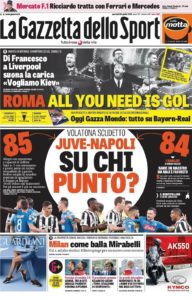 La Gazzetta dello Sport odierna cita, a suo modo, i Beatles per incitare la Roma in vista della super sfida di Champions contro il Liverpool stasera. Il tecnico dei giallorossi suona la carica. “Vogliamo Kiev”. In primo piano anche la volatona scudetto tra Juventus e Napoli, dopo che gli azzurri nel big match di domenica sera sono riusciti a riaprire il campionato. Ora è sfida punto su punto, con i bianconeri che hanno un calendario più complicato rispetto agli uomini di Sarri. Il quotidiano rosa parla anche di Milan, sottolineando come il ds rossonero Mirabelli sia in bilico. Infatti, Elliott starebbe spingendo per un nuovo corso tecnico.