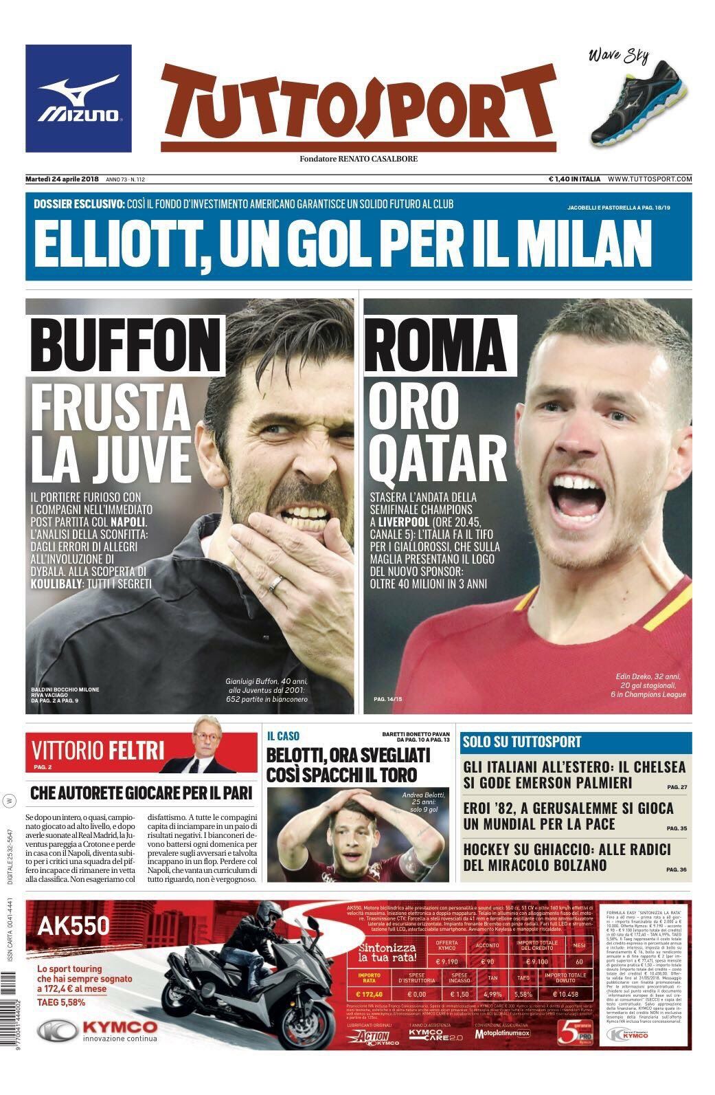 Prima pagina di Tuttosport dedicata a Buffon e Dzeko. Il portiere della Juventus e della Nazionale striglia i suoi dopo la sconfitta interna con il Napoli. Il bomber bosniaco della Roma è il condottiero che dovrà portare i suoi a Kiev. Stasera l’andata della semifinale Champions con il Liverpool. Intanto i giallorossi presentano il logo del nuovo sponsor che gli garantirà 40 milioni in tre anni. Ritaglio alto tutto per il Milan, con il fondo di investimento Elliott che ha preparato un dossier esclusivo per garantire stabilità economica al club di Via Aldo Rossi. Primo piano anche per la crisi di Belotti che spacca il Toro.