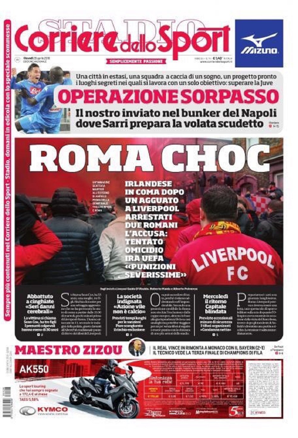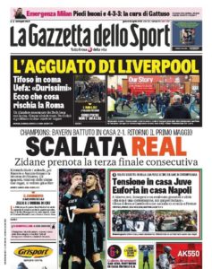La prima pagina del Corriere dello Sport apre con l’agguato degli ultras della Roma a Liverpool. Il tifoso irlandese dei Reds è in coma dopo aver subito sei danni cerebrali. Arrestati due tifosi giallorossi. Sono attese in giornata sanzioni esemplari della UEFA: la Roma trema. Ritaglio in alto per l’operazione sorpasso da parte del Napoli. Ora la città, i tifosi e gli addetti ai lavori credono in questo sogno tricolore. Intanto Sarri prepara a Castel Volturno la sfida alla Fiorentina. Spazio anche per il Real Madrid che, nella seconda semifinale di Champions League, batte in rimonta 1-2 il Bayern e vede la terza finale consecutiva.