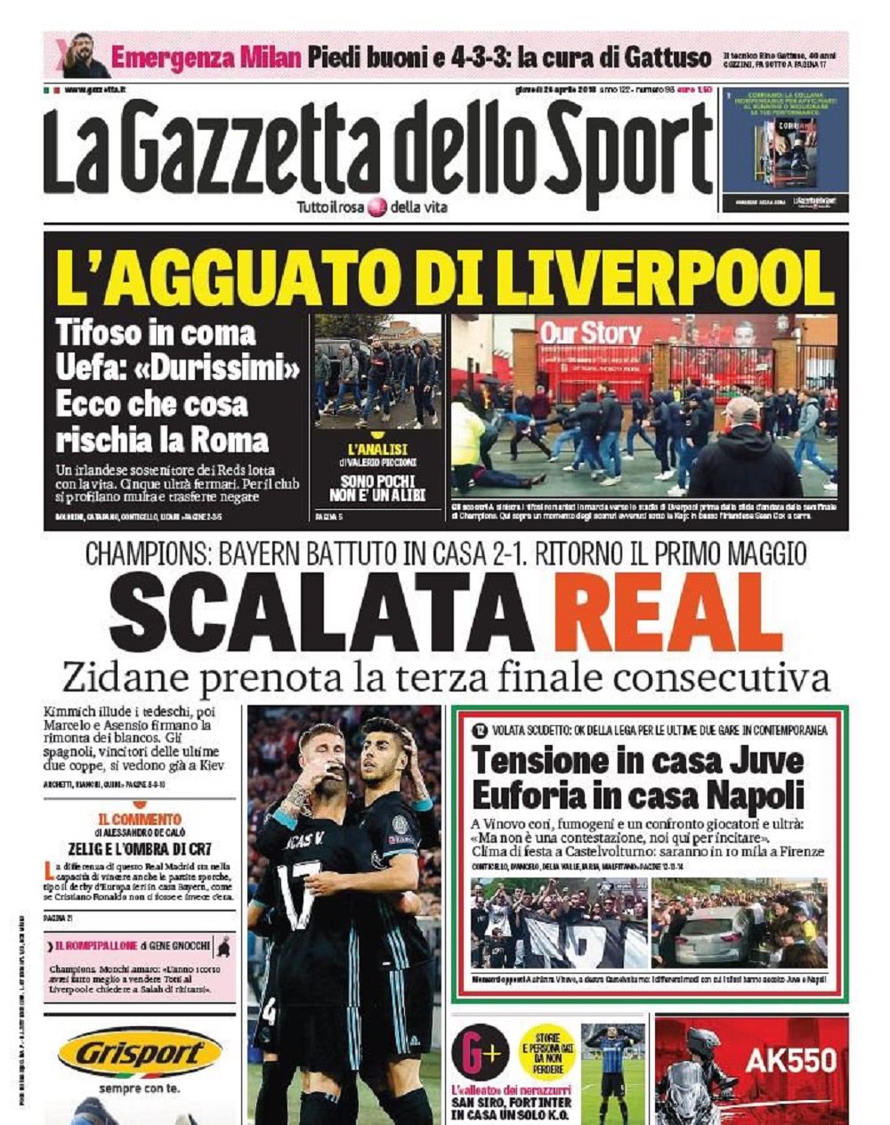 La prima pagina odierna de La Gazzetta dello Sport apre con la “Scalata Real”. Zidane prenota la terza finale di Champions League consecutiva dopo la vittoria in rimonta di ieri sera per 1-2 in casa del Bayern Monaco. In goal per i bavaresi Kimmich, mentre per le Merengues hanno ribaltato la gara le reti di Marcelo e Marco Asensio. Spazio anche per la Roma che rischia sanzioni importanti dopo l’agguato degli ultras al tifoso del Liverpool, ancora in coma. Prima pagina anche oggi per la volata Scudetto. In casa Juventus la tensione è alle stelle, mentre a Napoli, gli uomini di Sarri sono euforici per questo Rush finale. Ritaglio in alto per l’emergenza Milan. Gattuso riparte dal 4-3-3 e dai pedi buoni.