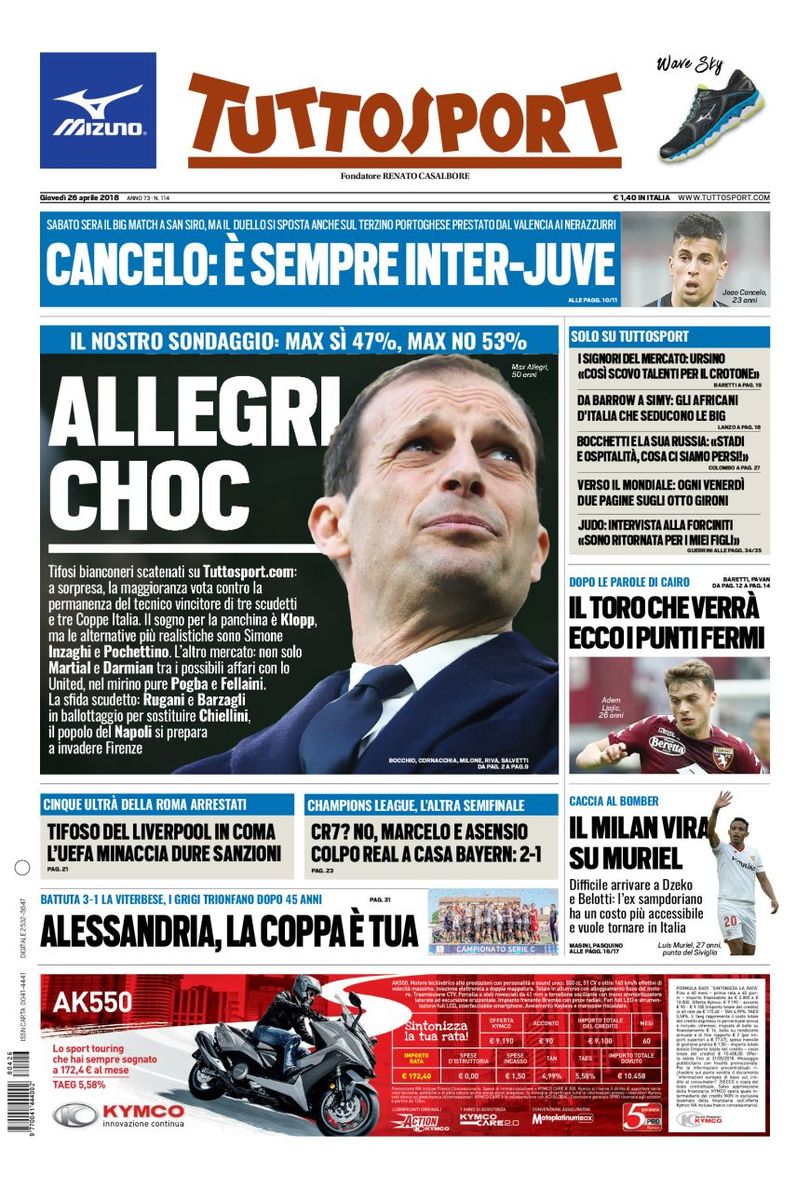 Tuttosport apre con “Allegri choc”. Titolo che fa riferimento al sondaggio effettuato dal quotidiano torinese che vorrebbe l’allenatore bianconero lontano da Vinovo a partire dalla prossima stagione. Spazio per la Champions League con la Roma che rischia grosso dopo l’agguato dei tifosi giallorossi sul tifoso del Liverpool. Il campo, invece, ha parlato ieri sera nella seconda semifinale tra Bayern Monaco e Real Madrid. Gli uomin di Zidane si sono imposto per 1-2 in rimonta. Kimmich in rete per i bavaresi, mentre Marcelo e Asensio in goal per i Blancos. Un po’ di calciomercato con il Milan protagonista. Secondo il quotidiano torinese, i rossoneri pensano a Muriel visto le trattative complicate per arrivare a Belotti e Dzeko.