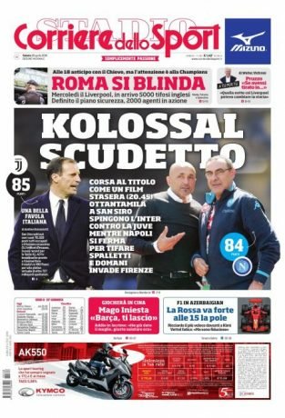 “Kolossal Scudetto”. Così apre il Corriere dello Sport facendo riferimento alla corsa tricolore tra Juventus e Napoli. Stasera a San Siro il derby d’Italia, mentre domani gli azzurri a Firenze cercano i tre punti sperando negli uomini di Spalletti. Ritaglio in alto per l’invasione inglese prevista mercoledì prossimo per la sfida di ritorno tra Roma e Liverpool. Prima pagina anche per l’addio al Barcellona del genio Andres Iniesta. Anche la Formula uno in primo piano, con le rosse che vanno forte nelle libere, in attesa della pole delle 15 di oggi.