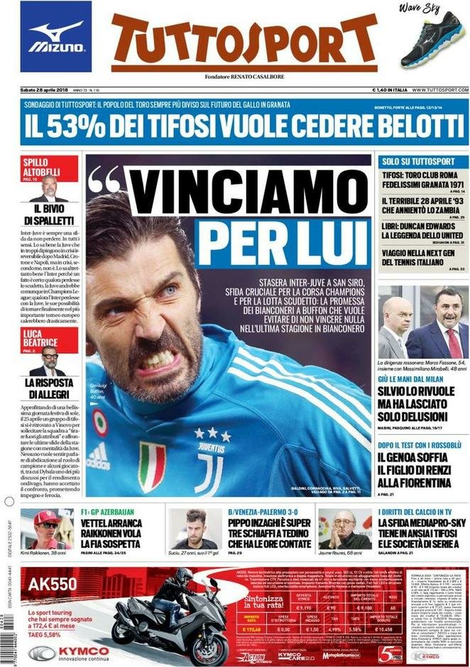 Tuttosport apre con “Vinciamo per lui” riferendosi a Gianluigi Buffon che senza Scudetto potrebbe lasciare senza un trofeo la sua ultima stagione. Ritaglio in alto per Belotti. I tifosi del Torino sono favorevoli alla cessione del Gallo. Spazio anche per il Milan e le dichiarazioni di Berlusconi che fanno ancora rumore. Primo piano anche per la Serie B con i due anticipi giocati ieri sera. Il Venezia strapazza per 3-0 il Palermo, mentre il Bari vince di misura sull’Entella.