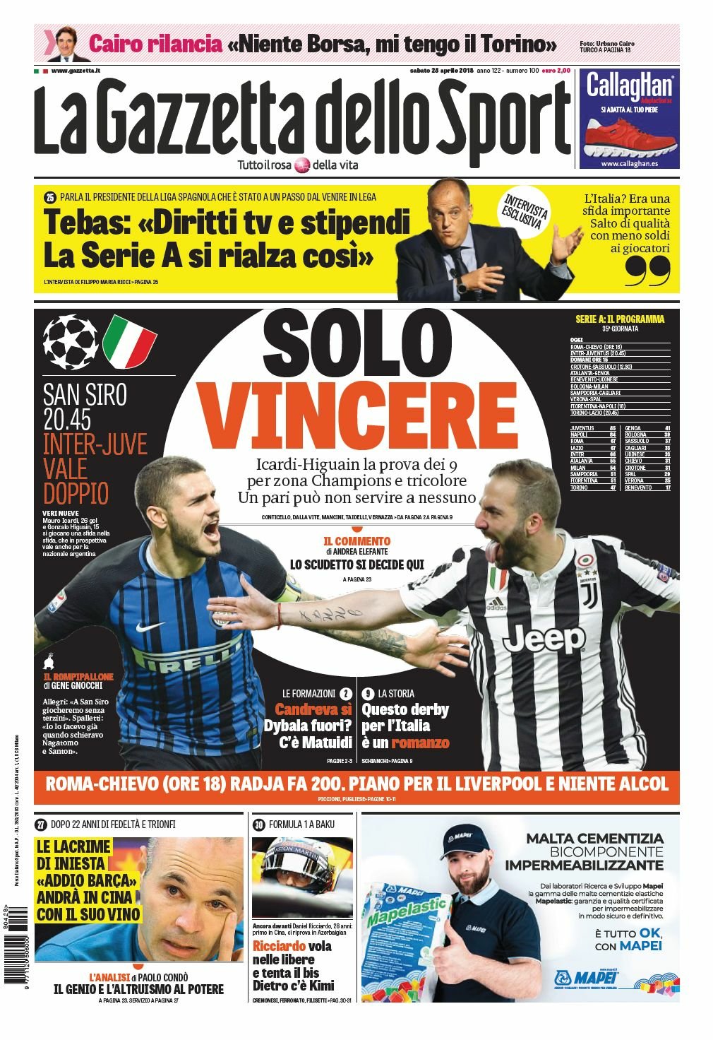 “Solo vincere”. La Gazzetta dello Sport odierna apre così in vista del derby d’Italia in programma questa sera a San Siro. Sia Inter che Juventus sono obbligate a vincere per continuare rispettivamente il sogno Champions d la rincorsa al settimo tricolore consecutivo. Ritaglio in alto dedicato alla spinosa questione dei diritti TV, con un’intervista esclusiva a Tebas, il presidente della Liga spagnola. Prima pagina anche per la Roma oggi impegnata alle 18 contro il Chievo. Nainggolan tocca quota 200, intanto c’è il piano anti-Liverpool. Spazio anche per Andres Iniesta che in lacrime ha annunciato il suo addio al Barcellona.