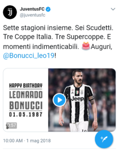 Oggi compie gli anni il capitano del Milan, Leonardo Bonucci, uno dei grandi nomi del mercato estivo che ha deciso di lasciare la Juventus per tentare l’avventura altrove. Per il 31esimo compleanno, Bonucci ha ricevuto una gradita sorpresa, gli auguri social della sua ex squadra, la Juventus.