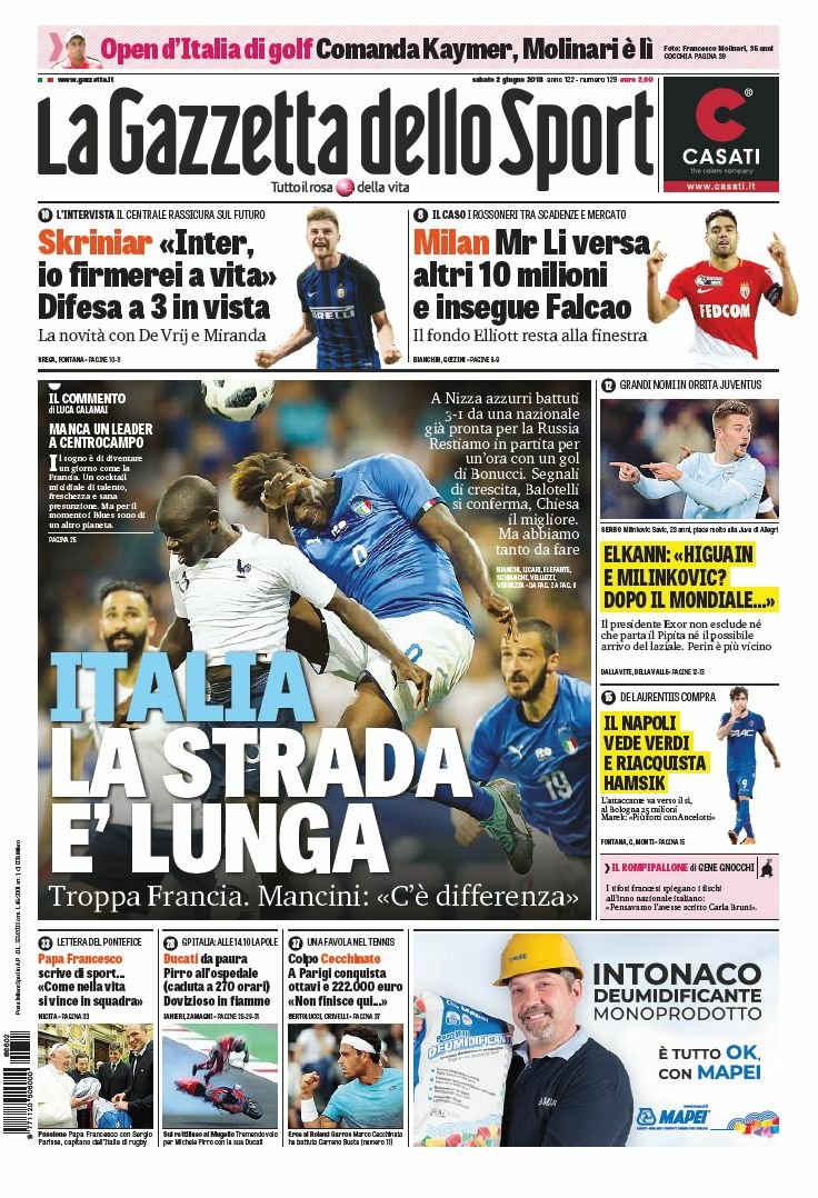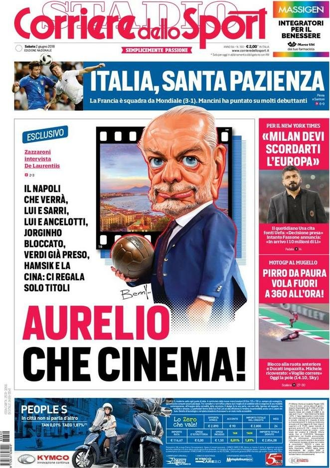 L’edizione odierna del Corriere dello Sport dedica la prima pagina a Aurelio De Laurentis e quel che sarà del suo nuovo Napoli. Spazio anche per la nazionale che, con tanti debuttanti in campo, perde 3-1 sotto il colpi della Francia. Primo piano anche per le dichiarazioni del New York Times sul Milan che lo vorrebbero fuori dall’Europa.