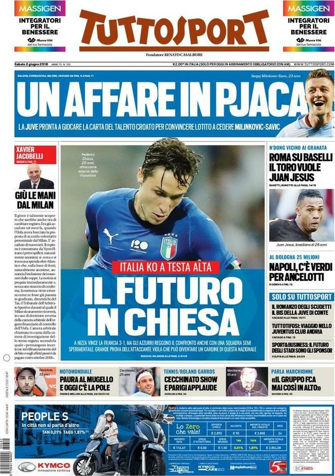 Ecco la prima pagina di Tuttosport. ⚽ L’Italia perde per 3-1 contro la Francia, ma trova un grande Chiesa⚽ Juve: Pjaca più soldi per Milinkovic-Savic. ⚽ Roma su Baselli e Napoli su Verdi.