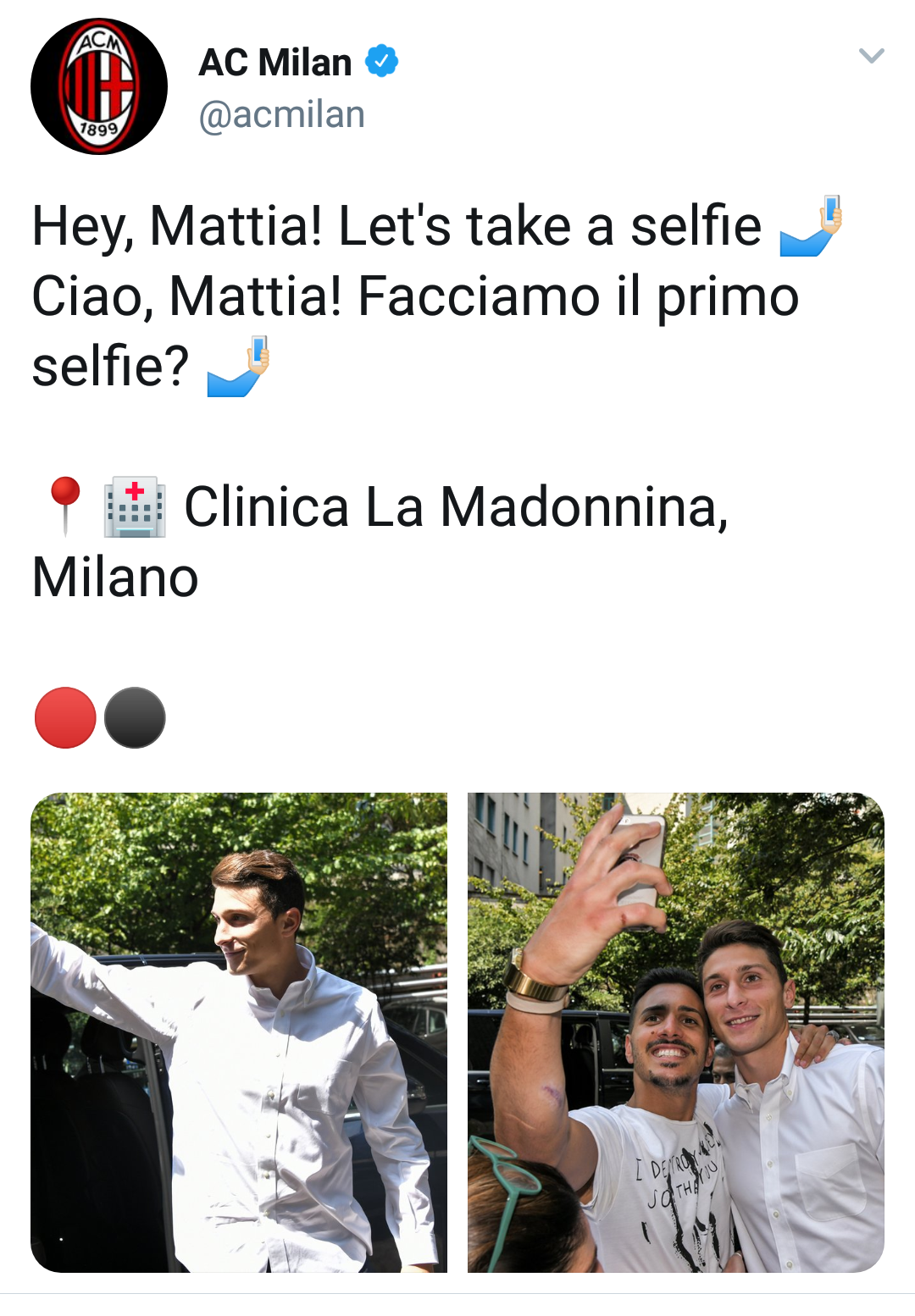 13:35- Ecco le prime foto di Mattia Caldara all’ingresso della clinica La Madonnina (fonte foto Twitter A.C. Milan)