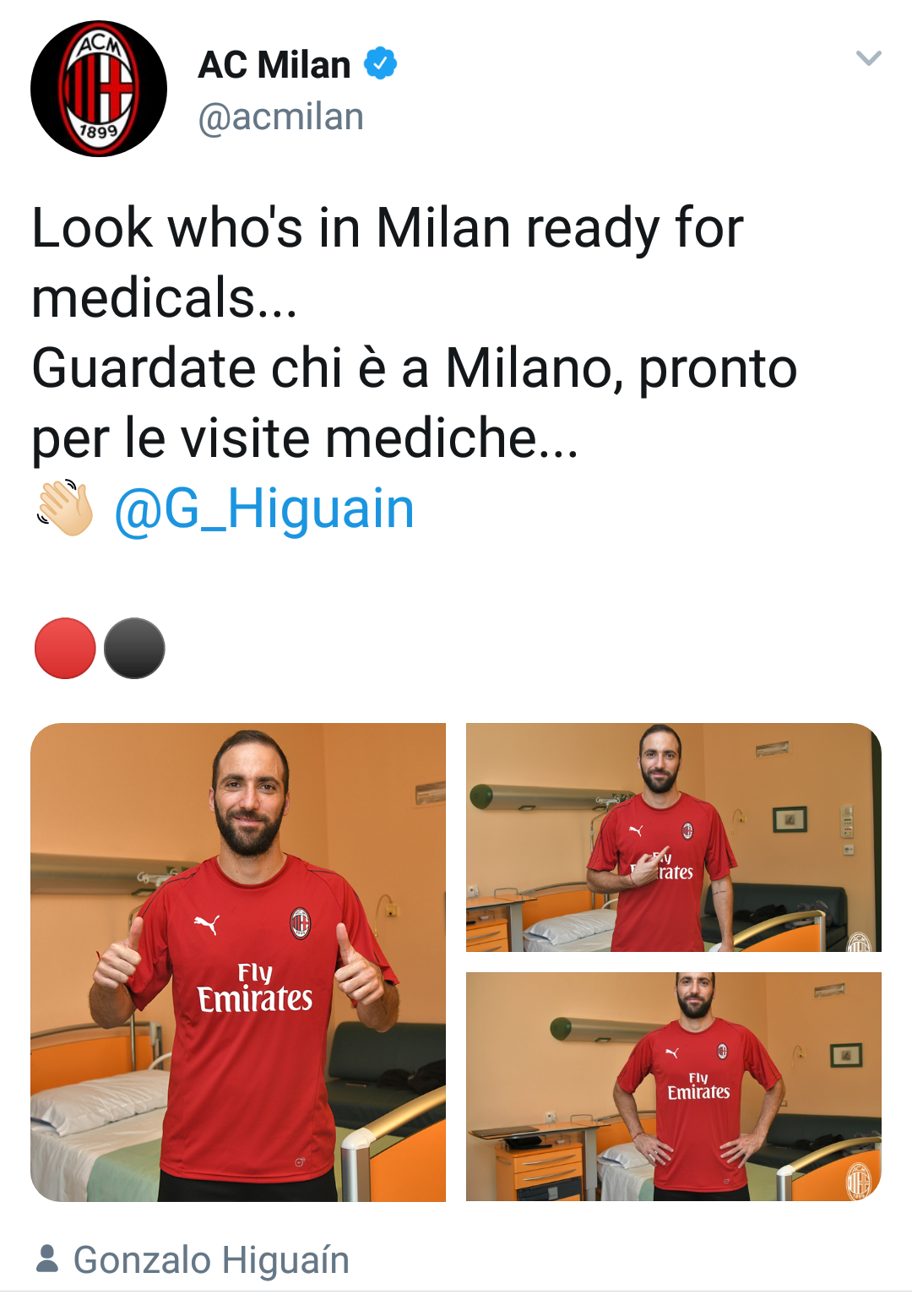 11:45- Le prime immagini in rossonero del Pipita. (fonte foto Twitter A.C. Milan)