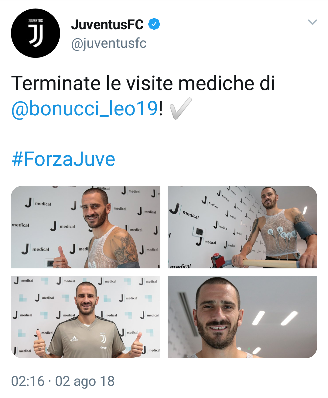 14:00- Intanto a Torino sono terminate le visite mediche di Leonardo Bonucci. Ufficialità prevista nel pomeriggio. Ora raggiungerà la sede per le firme sul contratto. (fonte foto Twitter Juventus F.C.)