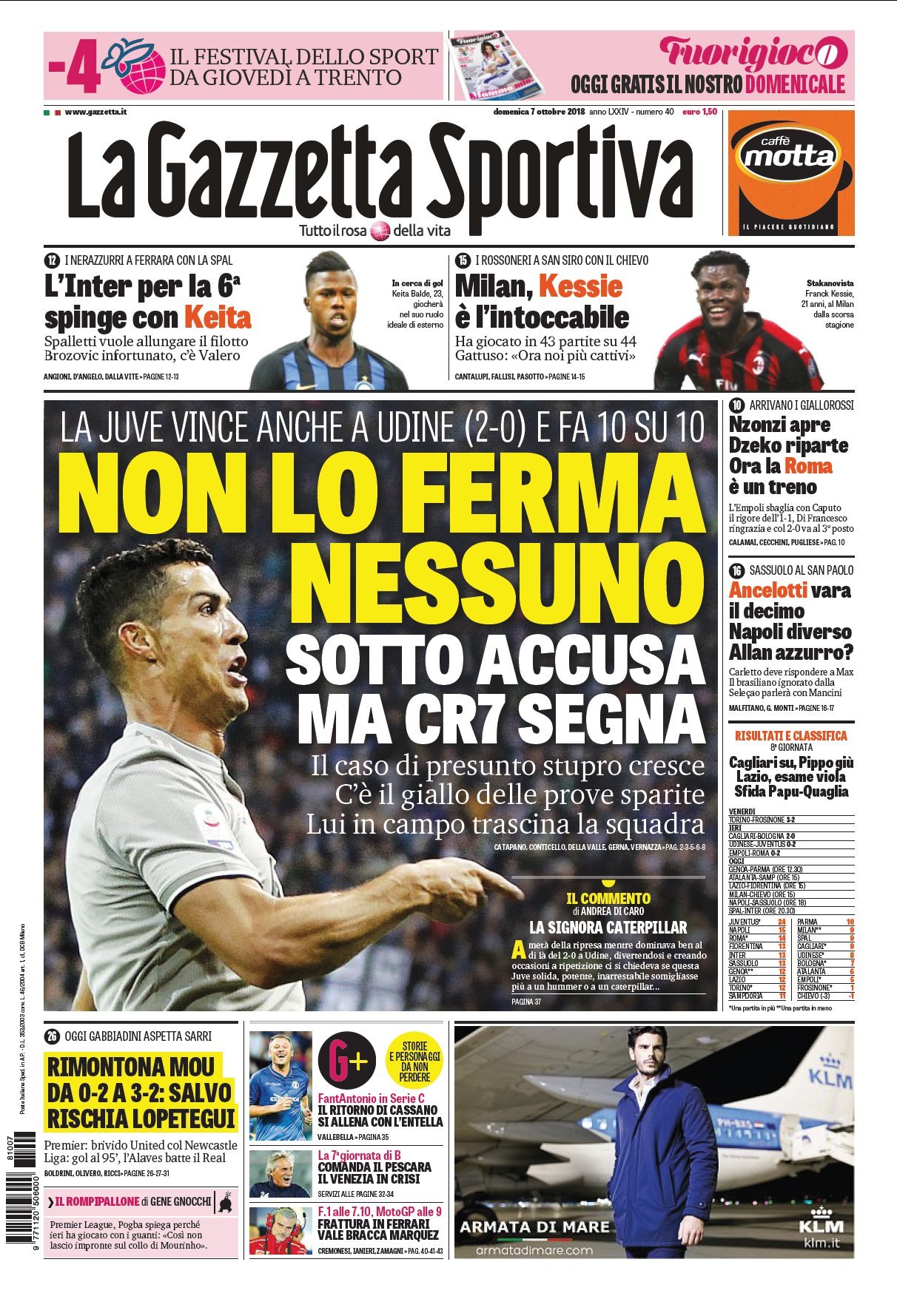 Su “La Gazzetta dello Sport” odierna: ⚽ Juve e CR7, non li ferma nessuno ⚽ Anche la Roma è un treno ⚽ L’Inter con Keita, il Milan è Kessie ? Il ritorno di Cassano.