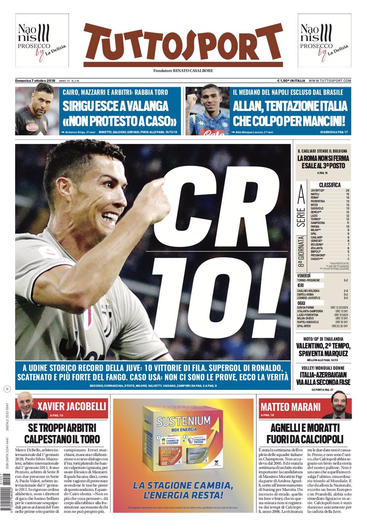 La prima pagina di “Tuttosport” dedicata alla vittoria della Juventus sull’Udinese con protagonista Cristiano Ronaldo. Tentazione Allan per la nazionale.