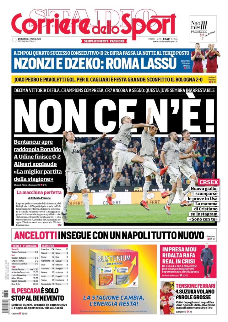 Sulla prima pagina del “Corriere dello Sport” spazio alle vittorie di Juventus e Roma negli anticipi di ieri. In campo oggi anche il Milan chiamato a riconfermarsi in casa contro il Chievo Verona, ancora senza punti in campionato.