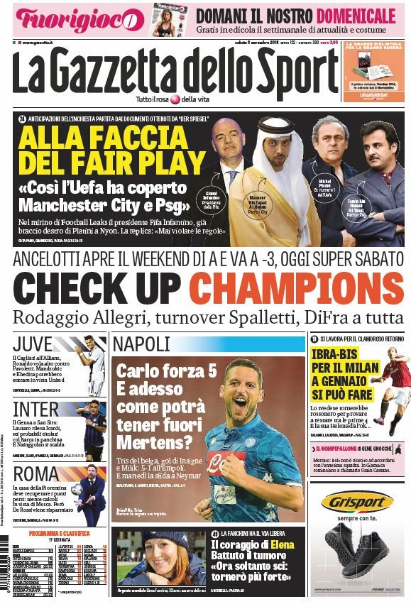 Le prime pagine dei principali quotidiani sportivi nazionali di Sabato 3 Novembre 2018