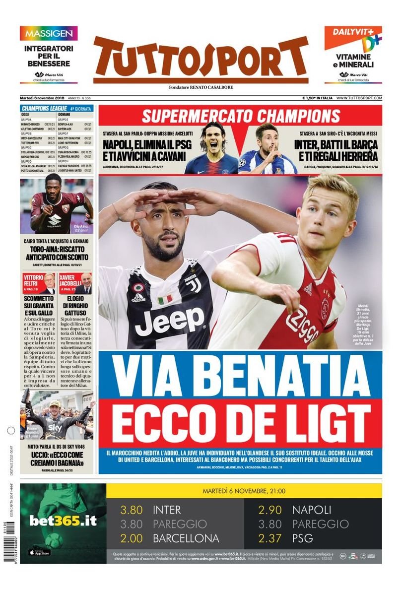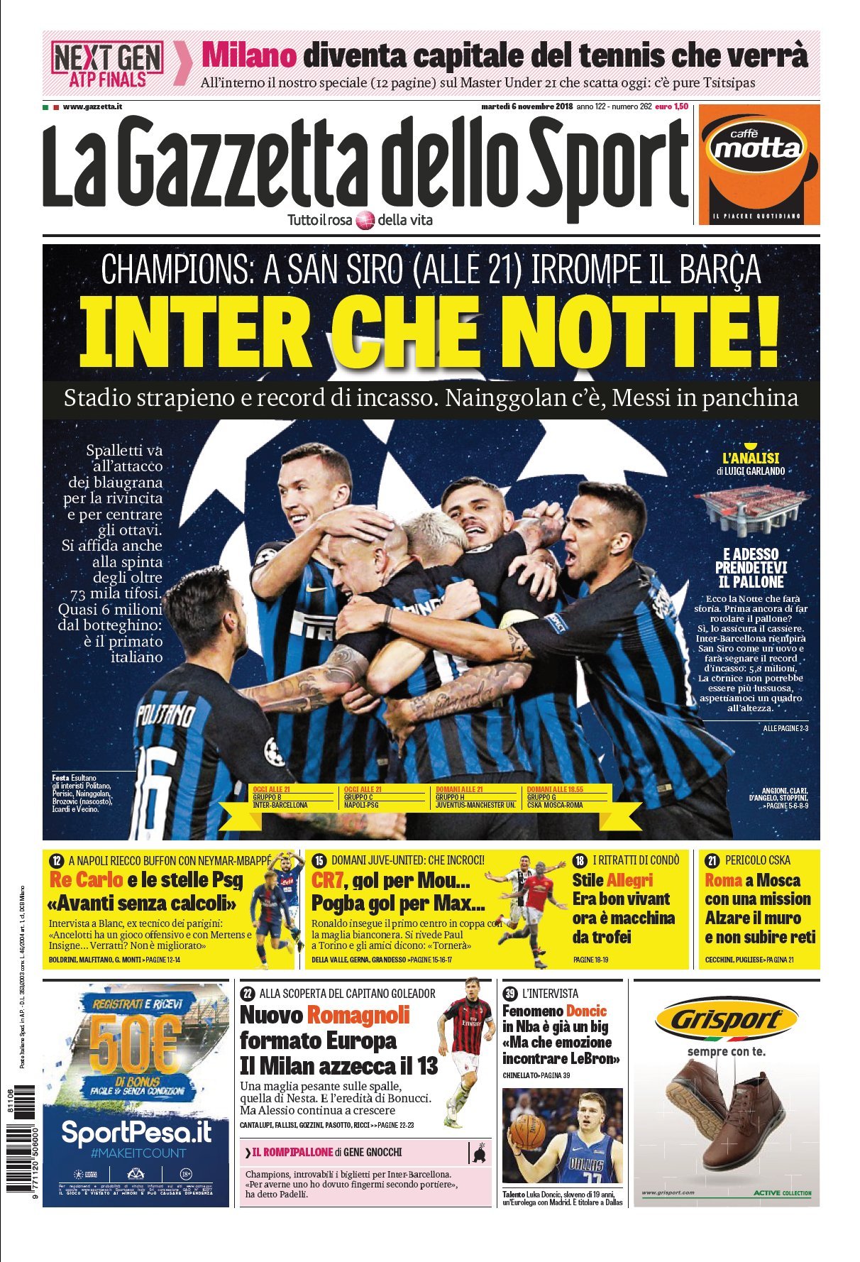 Le prime pagine dei principali quotidiani sportivi nazionali di Martedì 6 Novembre 2018