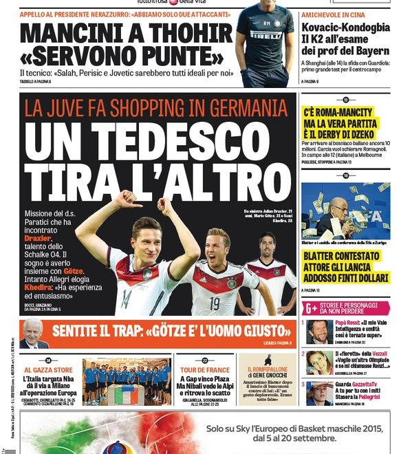 Poco Milan nella prima pagina dell’edizione odierna de ‘La Gazzetta dello Sport‘. Garcia vuol schierare Romagnoli nella partita odierna contro il Manchester City: fischio d’inizio alle ore 12 italiane.